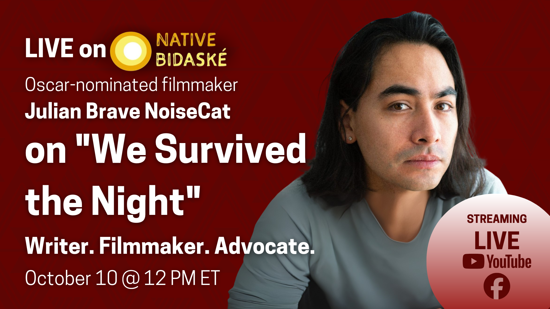 How do generations of story, struggle, and spirit shape what it means to survive? This Friday, October 10 at 12 p.m. ET, Native Bidaské host Levi Rickert sits down with Julian Brave NoiseCat to explore his forthcoming book, We Survived the Night, a deeply personal narrative of identity, memory, and reclamation.