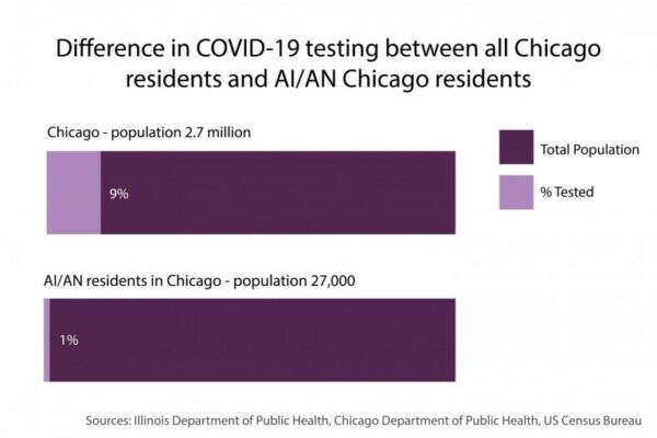 About 27,000 American Indian and Alaska Native people live in Chicago, which has a population of 2.7 million people overall, according to the U.S. Census Bureau. Less than one percent of the city’s Indigenous population received a COVID-19 test during the March through mid-June interval, while nearly 9 percent of Chicago’s overall population was tested for COVID-19 during the same period.
