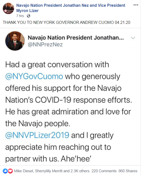 “Had a great conversation with @NYGovCuomo who generously offered his support for the Navajo Nation’s COVID-19 response efforts. He has great admiration and love for the Navajo people.