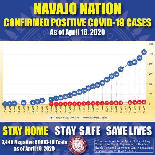 WINDOW ROCK, Ariz. — Coronavirus cases across the Navajo Nation have reached 1,042 confirmed, with 41 deaths, according to numbers supplied by the Navajo Department of Health and Navajo Area Indian Health Service, in coordination with the Navajo Epidemiology Center on Thursday evening.
