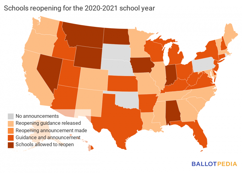 This map details states that have released guidance for school reopenings, announced the future reopening of schools to in-person instruction, or have allowed schools to reopen to in-person instruction. Courtesy of Ballotpedia.