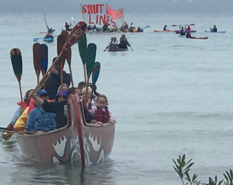 MACKINAW CITY, Mich. — Under a light drizzle, traditional Great Lakes canoes and a couple of dozen kayaks participated in the Sixth Annual Pipe Out Paddle Up Flotilla on Saturday morning at the Straits of Mackinac in Mackinaw City, Michigan. One hundred other people remained on shore to lend their support for those who participated in the flotilla.