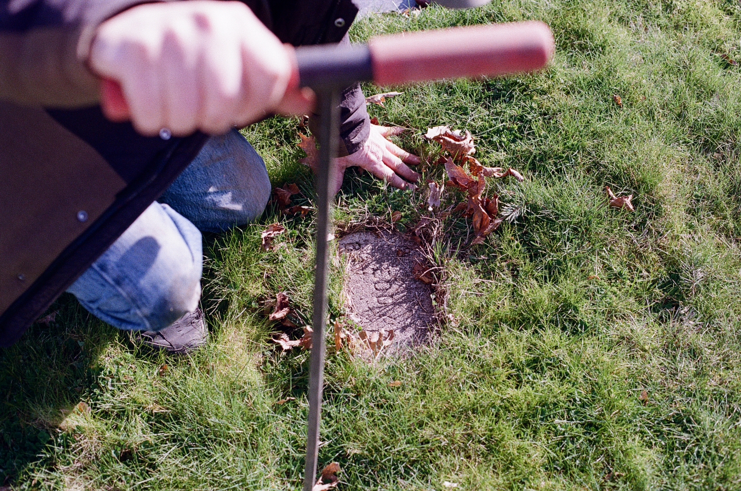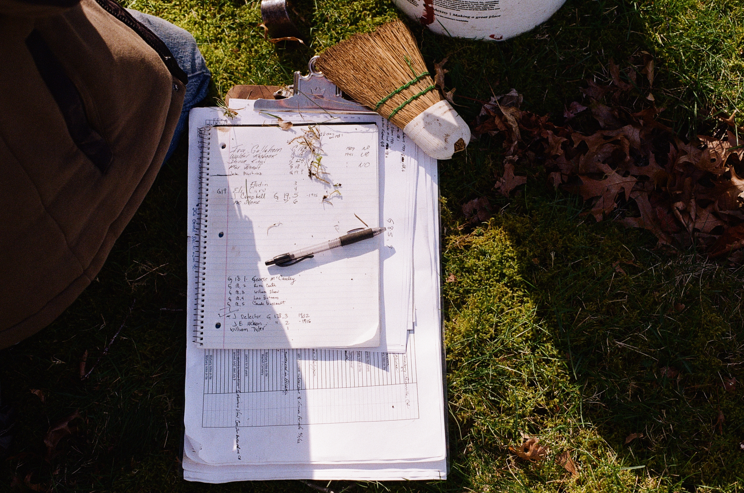 In the back row of the cemetery, where the Morningside patients lay underground, he counts three paces between where headstones should be, but overgrown grass has disguised many of them. When he successfully locates a stone using a long cylindrical soil probe, he uses a crowbar to unearth it from several inches in the ground, dust it off, and place it back atop its grave.